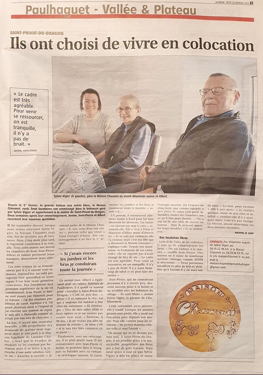 Jean-Pierre Vigier, Mikael Vacher et Annie Ricoux sont venus à ma rencontre le jeudi 20 juillet 2023 à la Maison Chaumet. Ils ont pris le temps d’écouter la présentation de notre maison partagée pour seniors et ont visité les lieux. Je les remercie très sincèrement pour leur visite chaleureuse et leur intérêt pour mon projet.